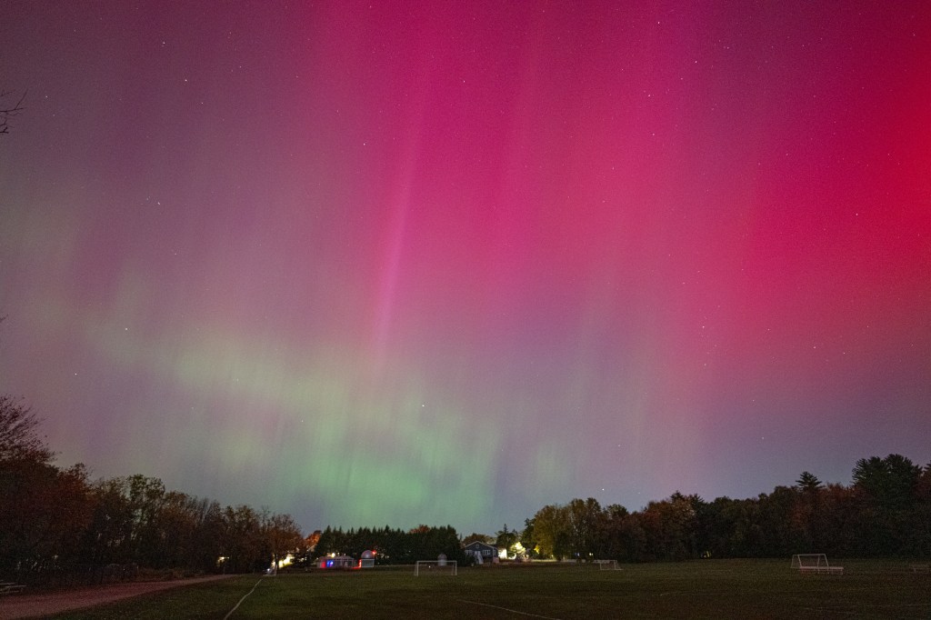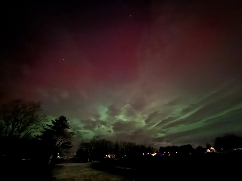 Between November 10 and 13 of this year we had another fine geomagnetic even caused by several CME that were hurled our way from a large sunspot group that was busy generating X class solar flares and associated CME outbursts. Aurora was seen across all of New Hampshire, through the entire continental USA and into Mexico. Emails came to us from friends in Arizona, showing aurora with saguaro cacti in the foreground: quite a sight! It was, fortunately, clear here that night after about 9pm until 2am, so we saw some fabulous aurora here. The magnetometer was also running and captured the event. Below you will find the images from both cell-phone and Nikon Z8 as well as the magnetometer traces. Note the times on these are in UTC for the days November 10, 11, 12, 13, 14. The Y-axis are in units of nT. Each day at 00h UTC, the variance is reset to 0nT by design.