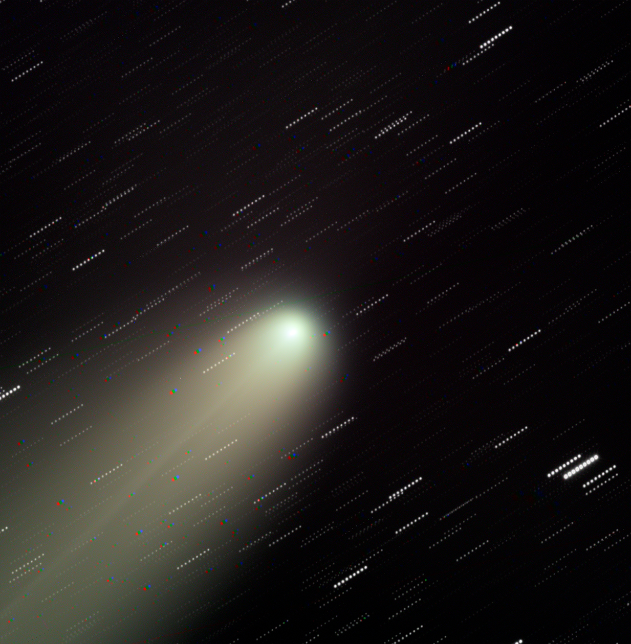 On 24th October, the comet had risen enough to be visible in the 0.7m telescope, so we gave it a go and imaged in Lum and RGB for the following close-up images. These are about 25×25 arc-minutes in dimension. Each is a 20 minute total integration comprised of ten, 2-minute integrations. One is summed and shows the stars as a series of points giving a good indication of the comet’s rapid movement relative to the background stars. The other image is a median which removes the stars and allows one to enjoy the comet’s details without distraction.