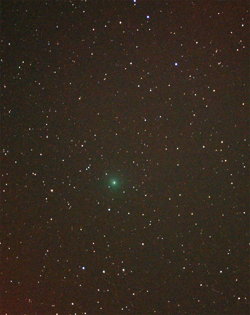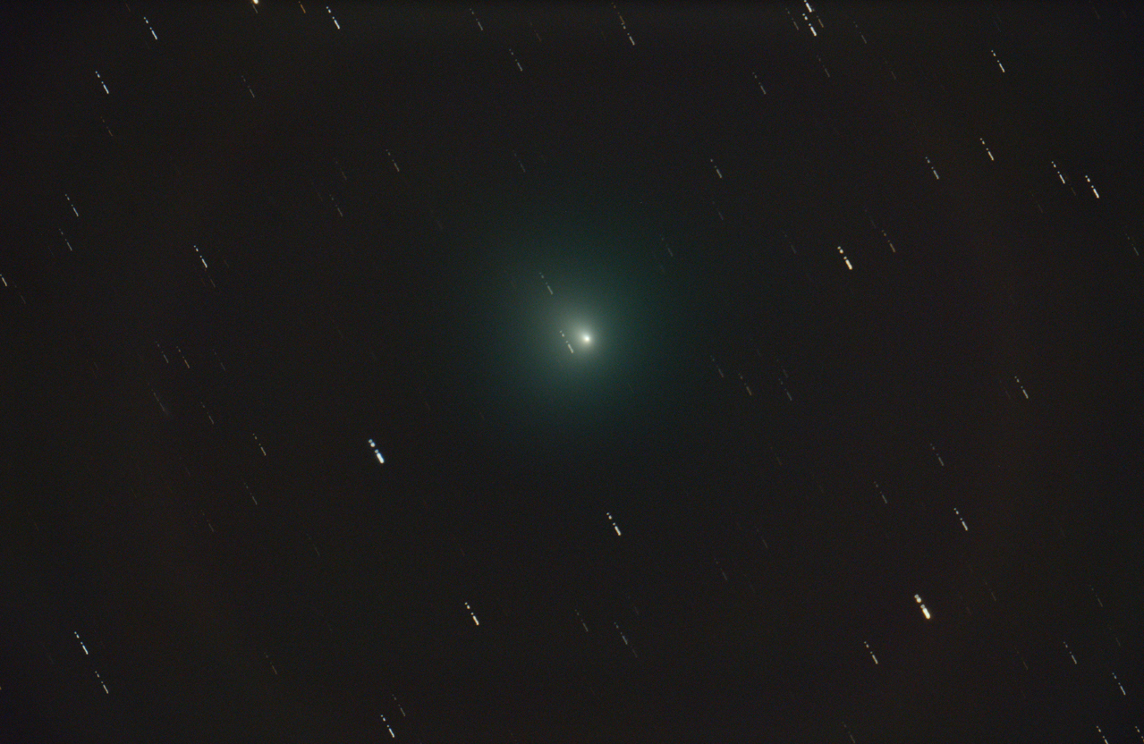 Comet 46P/Wirtanen: One is through the 16″, the other is a wider field view through a telephoto lens. The brilliant green color is striking and caused by the excited gases: cyanogen (CN)2 and diatomic carbon (C2).