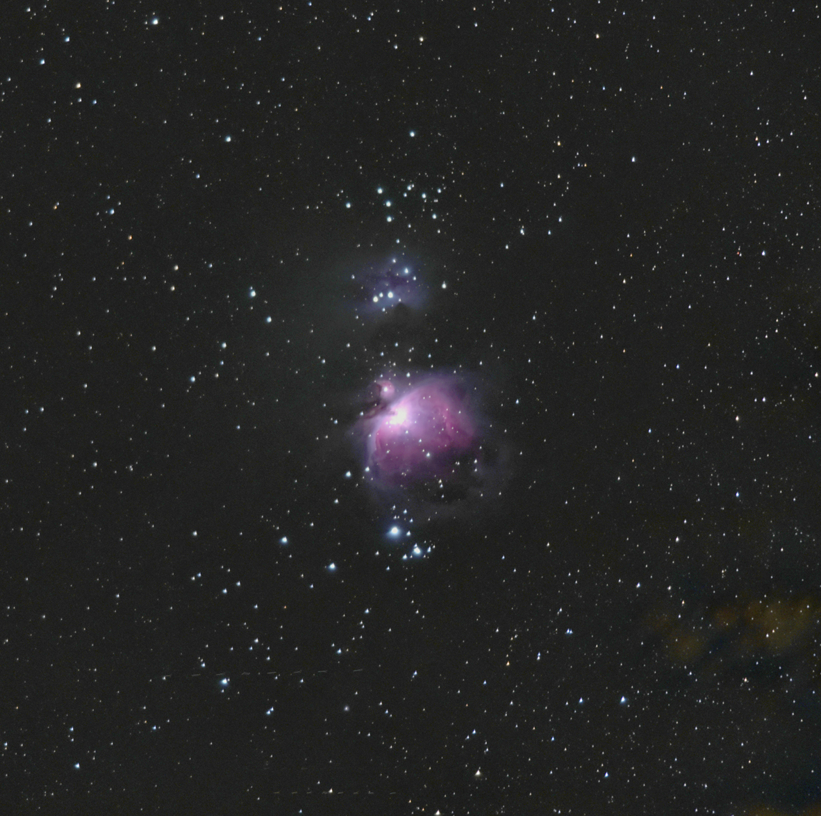 The Orion Nebula, M-42, a star birth region about 1300 light-years away. This can be seen with binoculars and small telescopes easily. It was almost too bright for our CCD imager!