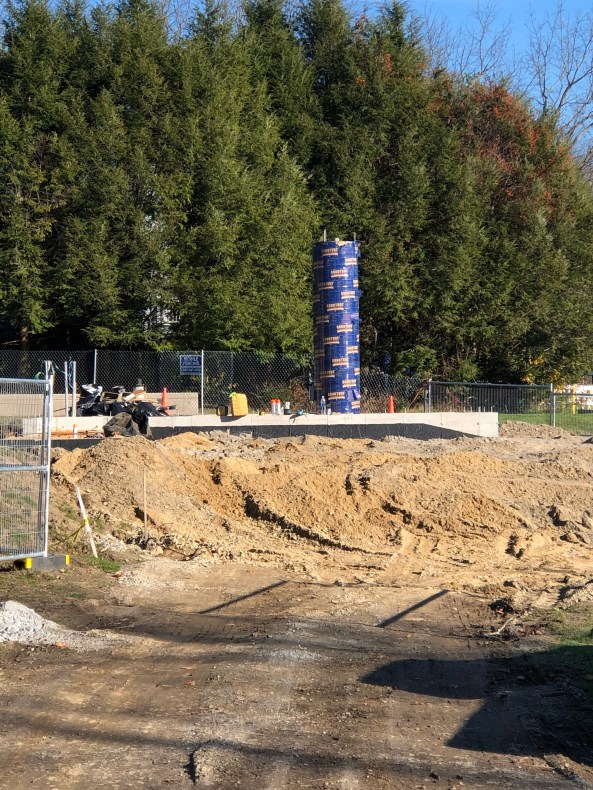 The four walls are up, and the roof’s lower layers have been installed. There is also a ring for the dome.